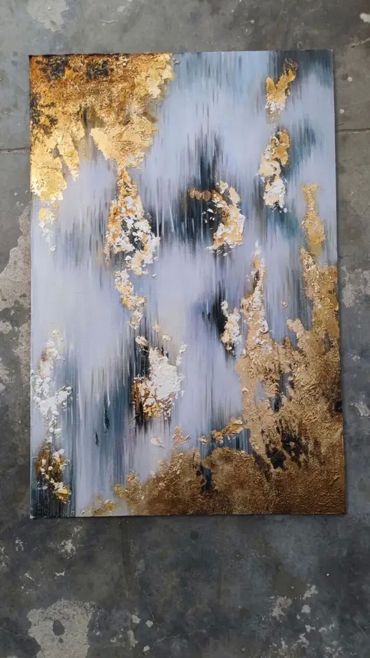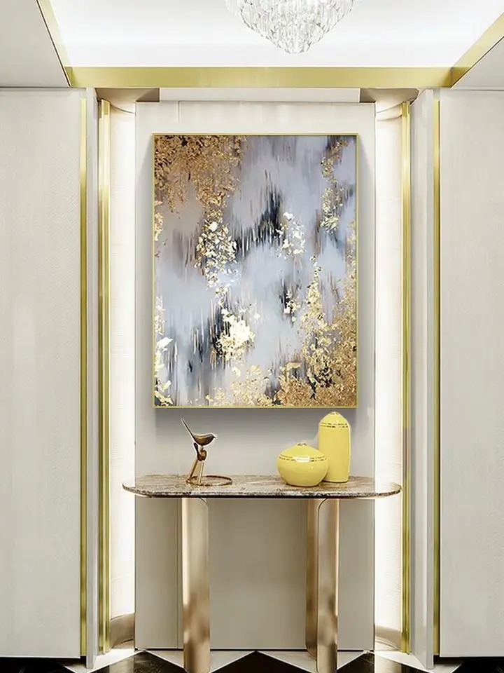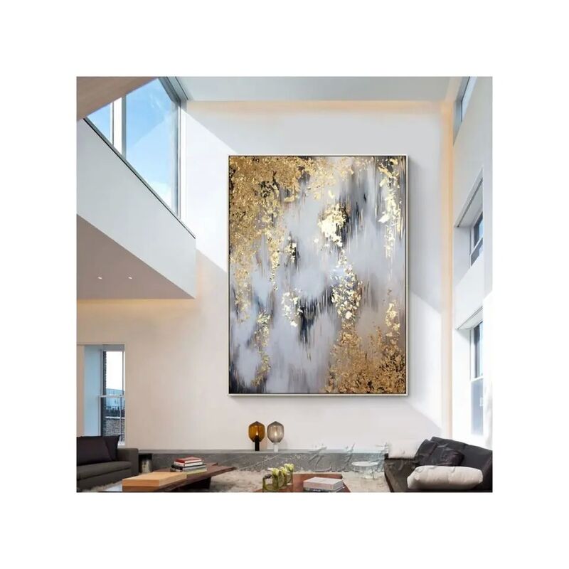Altın soyut folyo vurgularla elle boyanmış yağlı tabloları içeren toptan soyut kanvas duvar dekoru. Her parça, çevre dostu malzemeler ve geleneksel teknikler kullanılarak %100 el yapımıdır.
